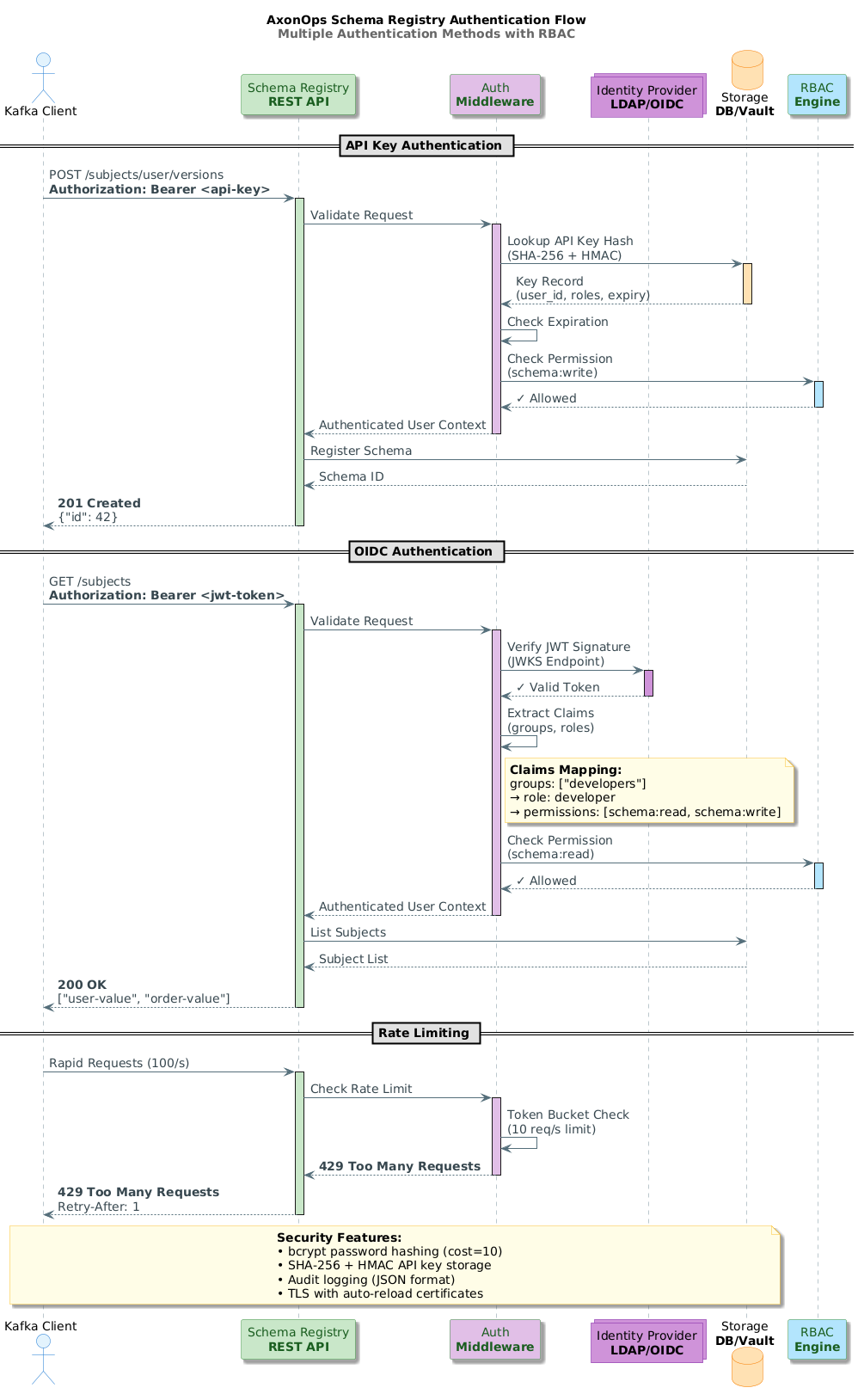 | Auth Method | AxonOps | Confluent OSS | Confluent Enterprise | Karapace | Apicurio |