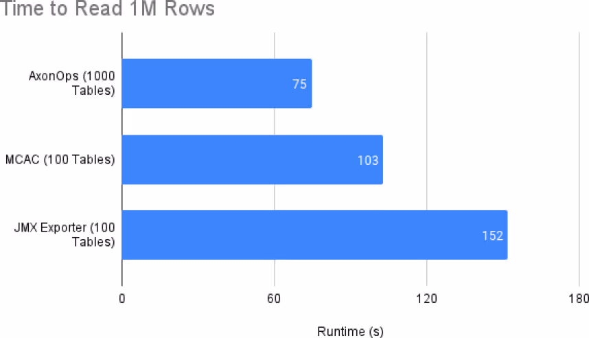 Usually, writing to Cassandra is limited by the CPU, while reading is limited by disk throughput. So, I thought the read speed would be about the same for the Cassandra clusters tracked by the AxonOps agent and MCAC exporter since 1 million read operations would apply disk pressure rather than CPU pressure.