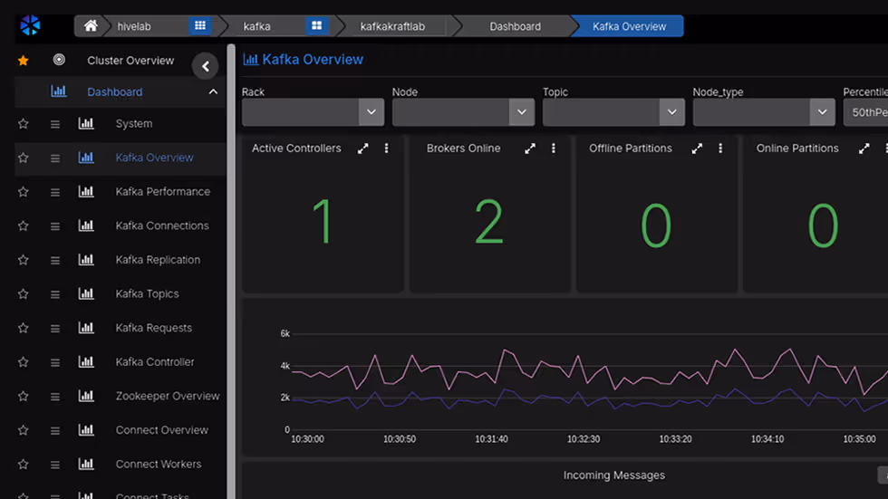 All your Kafka metrics and logs ingested and surfaced through predefined, dynamic customisable dashboards to display and cross reference all your key information. Keep your finger on the pulse of a healthy cluster.