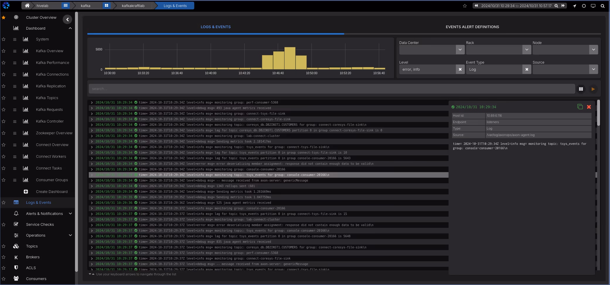 AxonOps agent not only collects the performance metrics, but it collects your Kafka logs too, A fully searchable logs dashboard allowing you to create charts comparing logs to the performance dashboards ensuring lightning fast root cause analysis.